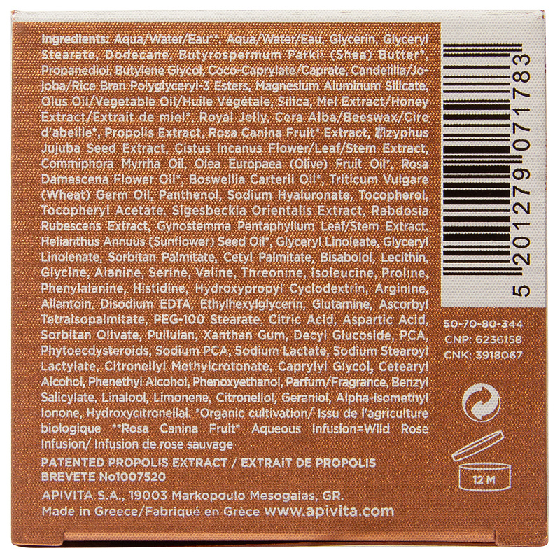 Состав: aqua/water/eau**, aqua/water/eau, glycerin, glyceryl stearate, dodecane, butyrospermum parkii (shea) butter*, propanediol, butylene glycol, coco-caprylate/caprate, candelilla/jojoba/rice bran polyglyceryl-3 esters, magnesium aluminum silicate, olus oil/vegetable oil/huile végétale, silica, mel extract/honey extract/extrait de miel*, royal jelly, cera alba/beeswax/cire d'abeille*, propolis extract, rosa canina fruit* extract, zizyphus jujuba seed extract, cistus incanus flower/leaf/stem extract, commiphora myrrha oil, oleaeuropaea (olive) fruit oil*, rosa damascena flower oil*, boswellia carterii oil*, triticum vulgare (wheat) germ oil, panthenol, sodium hyaluronate, tocopherol, tocopheryl acetate, sigesbeckia orientalis extract, rabdosiarubescens extract, gynostemma pentaphyllum leaf/stem extract, helianthus annuus (sunflower) seed oil*, glyceryl linoleate, glyceryl linolenate, sorbitan palmitate, cetyl palmitate, bisabolol, lecithin, glycine, alanine, serine, valine, threonine, isoleucine, proline, phenylalanine, histidine, hydroxypropyl cyclodextrin, arginine, allantoin, disodium edta, ethylhexylglycerin, glutamine, ascorbyl tetraisopalmitate, peg-100 stearate, citric acid, aspartic acid, sorbitan olivate, pullulan, xanthan gum, decyl glucoside, pca, phytoecdysteroids, sodium pca, sodium lactate, sodium stearoyl lactylate, citronellyl methylcrotonate, caprylyl glycol, cetearyl alcohol, phenethyl alcohol, phenoxyethanol, parfum/fragrance, benzyl salicylate, linalool, limonene, citronellol, geraniol, alpha-isomethyl ionone, hydroxycitronellal.