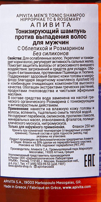 Шампунь тонизирующий против выпадения волос для мужчин, 250 мл