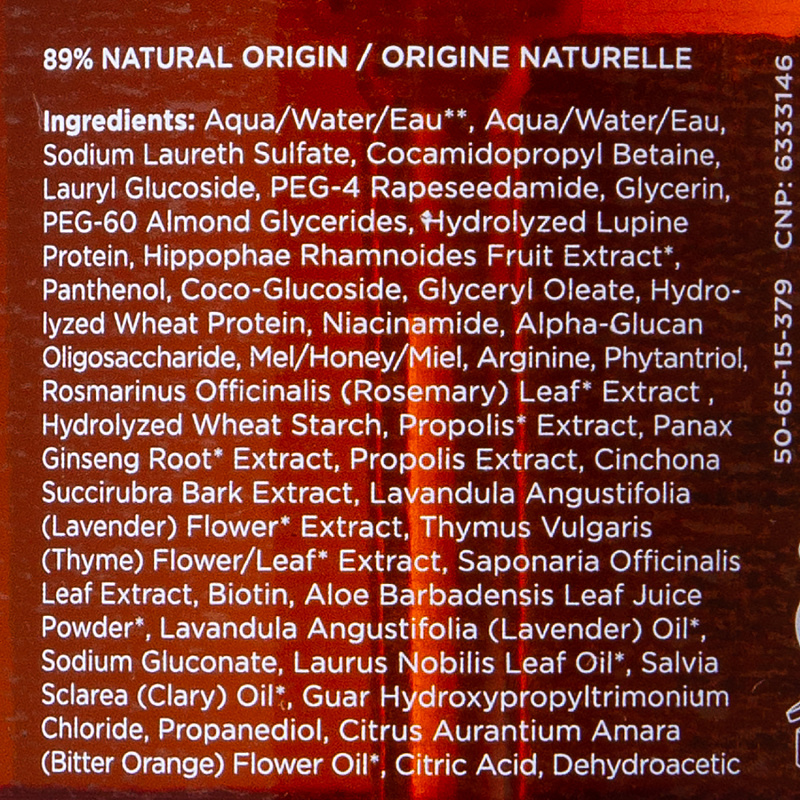Состав: aqua (water), aqua (water), sodium laureth sulfate, cocamidopropyl betaine, lauryl glucoside, peg-4 rapeseedamide,glycerin, peg-60 almond glycerides, hydrolyzed lupine protein, hippophae rhamnoides fruit extract, panthenol, gossypium herbaceum (cotton) flower extract, coco-glucoside, glyceryl oleate, hydrolyzed wheat protein, niacinamide, alpha-glucan oligosaccharide, mel (honey), arginine, phytantriol, rosmarinus officinalis (rosemary) leaf extract , hydrolyzed wheat starch, propolis extract, panax ginseng root extract, propolis extract, cinchona succirubra bark extract, lavandula angustifolia (lavender) flower extract, thymus vulgaris (thyme) flower/leaf extract, saponaria officinalis leaf extract, biotin, aloe barbadensis leaf juice powder, lavandula angustifolia (lavender) oil, sodium gluconate, laurus nobilis leaf oil, salvia sclarea (clary) oil, guar hydroxypropyltrimonium chloride, propanediol, citrus aurantium amara (bitter orange) flower oil, citric acid, dehydroacetic acid, sodium hydroxide, parfum (fragrance), benzyl alcohol, linalool, limonene from certified organic cultivation rosmarinus officinalis leaf aqueous infusion=rosemary water.