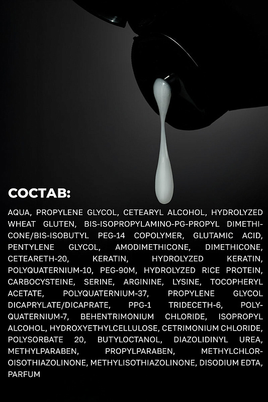 Состав: aqua, propylene glycol, cetearyl alcohol, hydrolyzed wheat gluten, bis-isopropylamino-pg-propyl dimethicone/bis-isobutyl peg-14 copolymer, glutamic acid, pentylene glycol, amodimethicone, dimethicone, ceteareth-20, keratin, hydrolyzed keratin, polyquaternium-10, peg-90m, hydrolyzed rice protein, carbocysteine, serine, arginine, lysine, tocopheryl acetate, polyquaternium-37, propylene glycol dicaprylate/dicaprate, ppg-1 trideceth-6, polyquaternium-7, behentrimonium chloride, isopropyl alcohol, hydroxyethylcellulose, cetrimonium chloride, polysorbate 20, butyloctanol, diazolidinyl urea, methylparaben, propylparaben, methylchloroisothiazolinone, methylisothiazolinone, disodium edta, parfum.