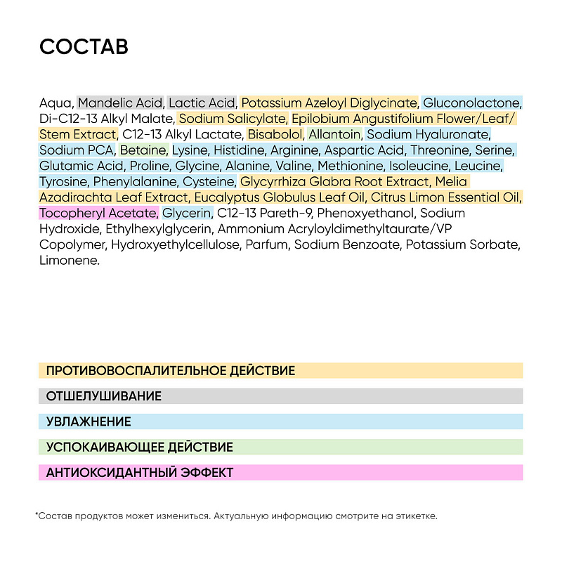 Состав: aqua, mandelic acid, lactic acid, potassium azeloyl diglycinate, epilobium angustifolium flower/leaf/stem extract, gluconolactone, sodium salicylate, di-c12-13 alkyl malate, ethylhexylglycerin, phenoxyethanol, bisabolol, allantoin, sodium hyaluronate, sodium pca, sodium lactate, arginine, aspartic acid, pca, glycine, alanine, serine, valine, proline, threonine, isoleucine, histidine, phenylalanine, glycyrrhiza uralensis (licorice) root extract, melia azadirachta leaf extract, eucalyptus globulus leaf oil, citrus limon essential oil, tocopheryl acetate, c12-13 alkyl lactate, coceth-7, ppg-1-peg-9 lauryl glycol ether, peg-40 hydrogenated castor oil, ammonium acryloyldimethyltaurate/vpcopolymer, hydroxyethylcellulose, parfum