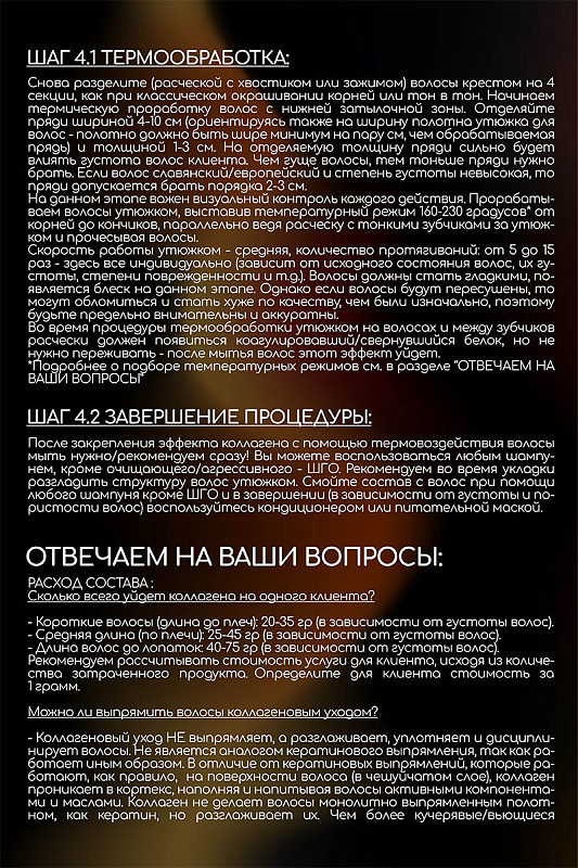 Коллагеновый уход для волос — это эффективное средство, которое заметно уплотняет и разглаживает пряди, придаёт им блеск и облегчает укладку. Благодаря накопительному эффекту, результат сохраняется от 1 до 4 месяцев, в зависимости от состояния ваших волос. Подходит для осветлённых и обесцвеченных локонов, не содержит резких запахов и вредных химических веществ, что делает его безопасным и комфортным для использования как профессионалами, так и клиентами.