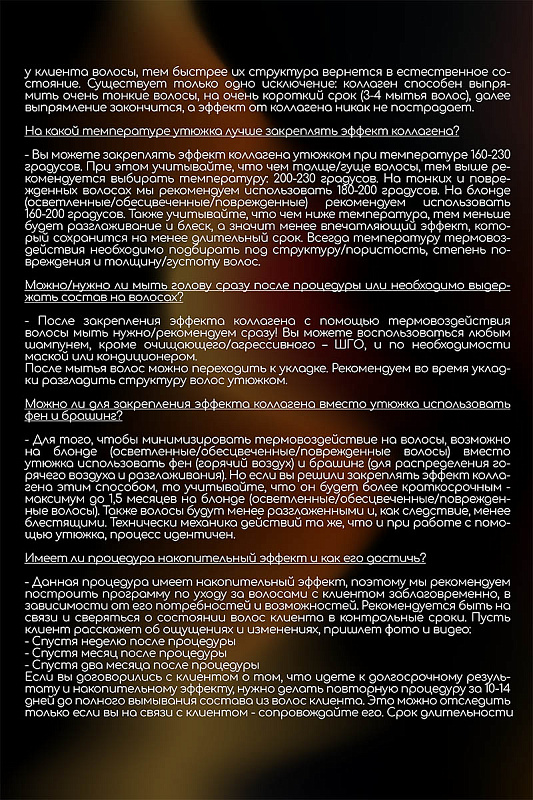 Термообработка феном с коллагеном внедряет состав в волосы, создавая защитную пленку и фиксируя уходовые средства. Волосы выглядят здоровыми. При перегруженности можно вымыть шампунем и использовать кондиционер или маску, сохраняя коллаген. Если волосы в норме, процедура завершена.