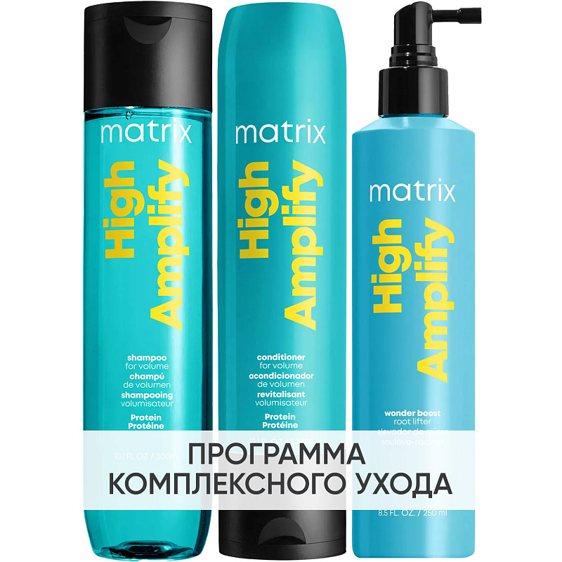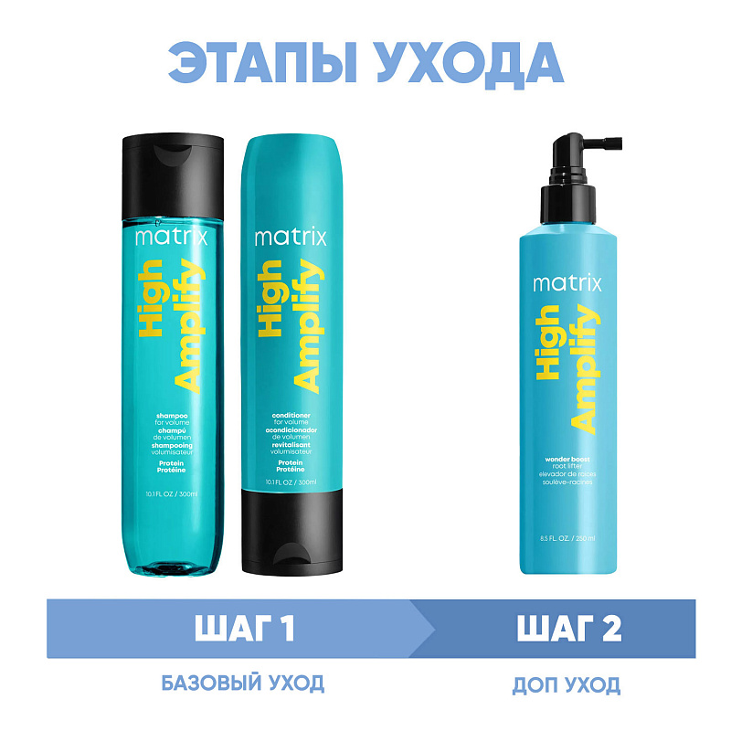ПРОГРАММА КОМПЛЕКСНОГО УХОДА Matrix High Amplify для увеличения объема и густоты волос. Комплексный уход представляет собой дополняющие друг друга средства, совместное использование которых будет максимально эффективным. Первым шагом программы является базовый уход (очищение + питание), вторым – дополнительный уход (средства, усиливающие эффект базовой программы и применяемые постоянно или периодически).