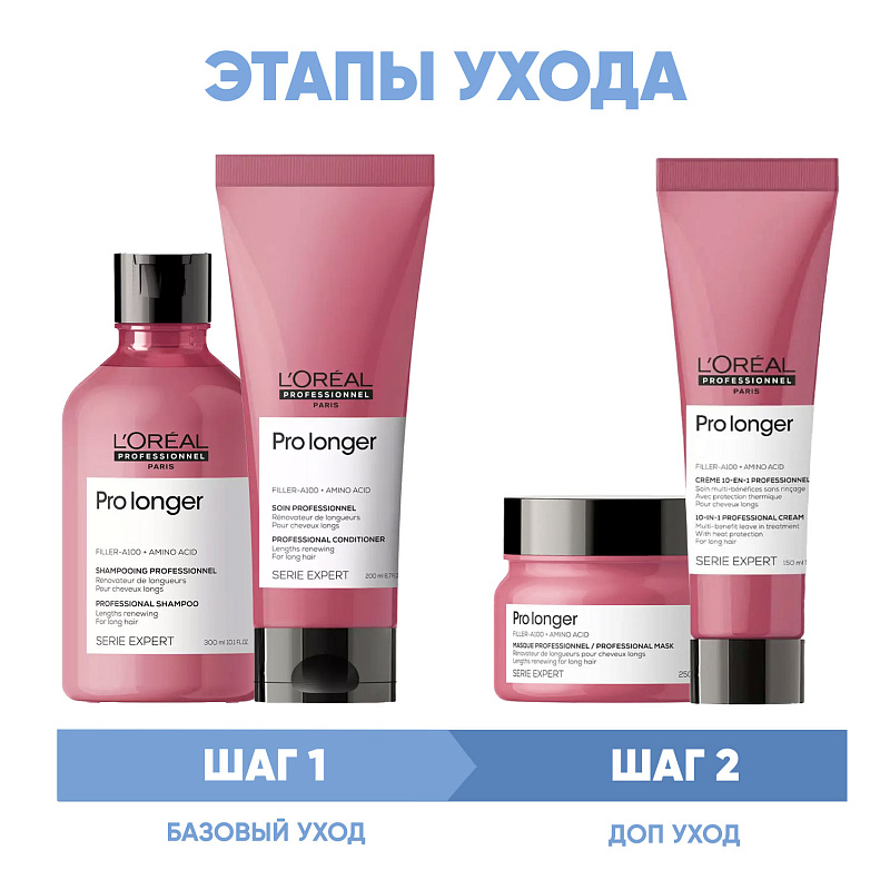 ПРОГРАММА КОМПЛЕКСНОГО УХОДА L'Oreal Professionnel Pro Longer для восстановления волос по всей длине. Комплексный уход представляет собой дополняющие друг друга средства, совместное использование которых будет максимально эффективным. Первым шагом программы является базовый уход (очищение + питание), вторым – дополнительный уход (средства, усиливающие эффект базовой программы и применяемые постоянно или периодически).