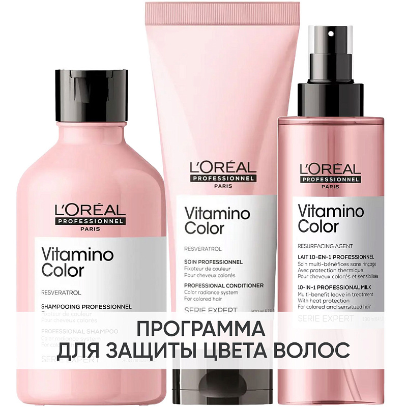 ПРОГРАММА КОМПЛЕКСНОГО УХОДА L'oreal Professionnel Vitamino Color для защиты цвета окрашенных волос. Комплексный уход представляет собой дополняющие друг друга средства, совместное использование которых будет максимально эффективным. Первым шагом программы является базовый уход (очищение + питание), вторым – дополнительный уход (средства, усиливающие эффект базовой программы и применяемые постоянно или периодически).