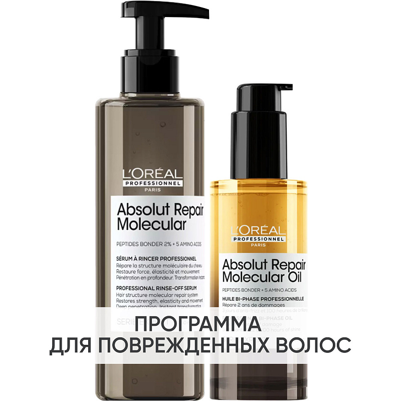 ПРОГРАММА КОМПЛЕКСНОГО УХОДА L'Oreal Professionnel Absolut Repair Molecular для поврежденных волос. Комплексный уход представляет собой дополняющие друг друга средства, совместное использование которых будет максимально эффективным. Первым шагом программы является базовый уход (очищение + питание).