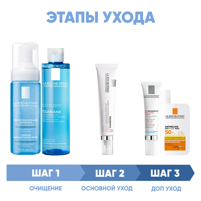 ПРОГРАММА КОМПЛЕКСНОГО УХОДА La Roche-Posay Redermic Retinol для борьбы с признаками старения лица. Комплексный уход представляет собой дополняющие друг друга средства, совместное использование которых будет максимально эффективным. Первым шагом программы является очищение, вторым - основной уход. В третий шаг вошли дополнительные средства, усиливающие эффект основной программы и применяемые постоянно или периодически на различных этапах ухода. Набор не имеет внешней упаковки, товары в заказы вкладываются по отдельности.