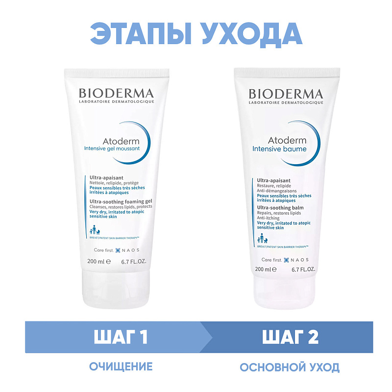 ПРОГРАММА КОМПЛЕКСНОГО УХОДА Bioderma Atoderm для ухода за атопичной, сухой, очень сухой и чувствительной кожей лица и тела. Комплексный уход - это дополняющие друг друга средства, совместное использование которых будет максимально эффективным. Первым шагом такой программы всегда является очищение. Вторым - основной уход, а третьим - дополнительный уход.