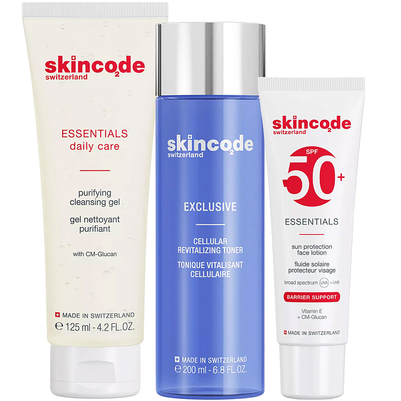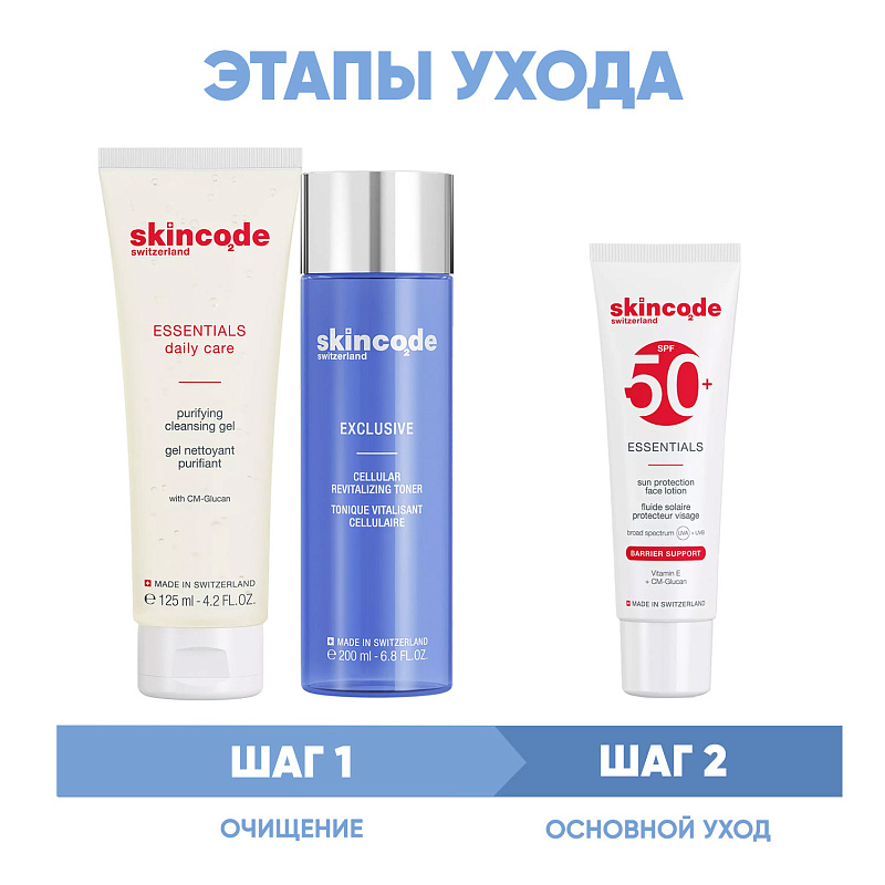 ПРОГРАММА КОМПЛЕКСНОГО УХОДА Skincode Exclusive для борьбы с признаками старения лица. Комплексный уход представляет собой дополняющие друг друга средства, совместное использование которых будет максимально эффективным. Первым шагом такой программы всегда является очищение. Вторым - основной уход, а третьим - дополнительный уход.