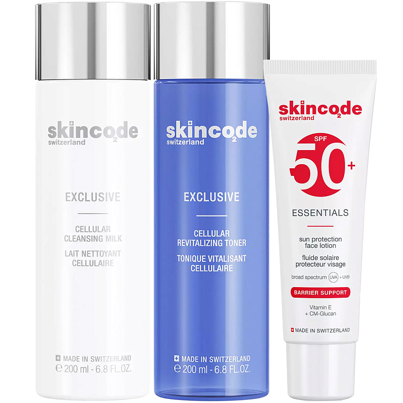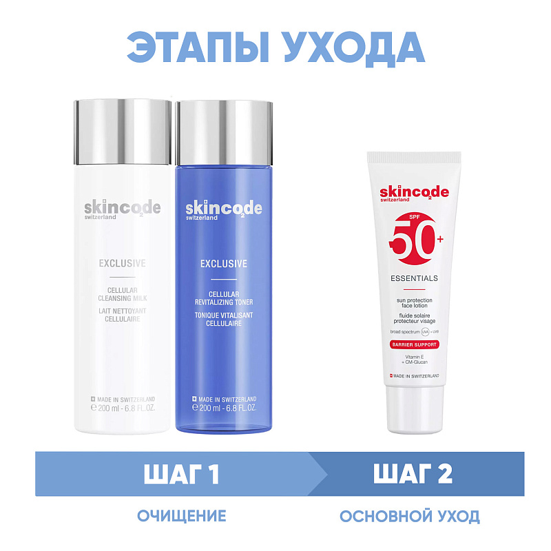 ПРОГРАММА КОМПЛЕКСНОГО УХОДА Skincode Exclusive для борьбы с признаками старения лица. Комплексный уход представляет собой дополняющие друг друга средства, совместное использование которых будет максимально эффективным. Первым шагом такой программы всегда является очищение. Вторым - основной уход, а третьим - дополнительный уход.