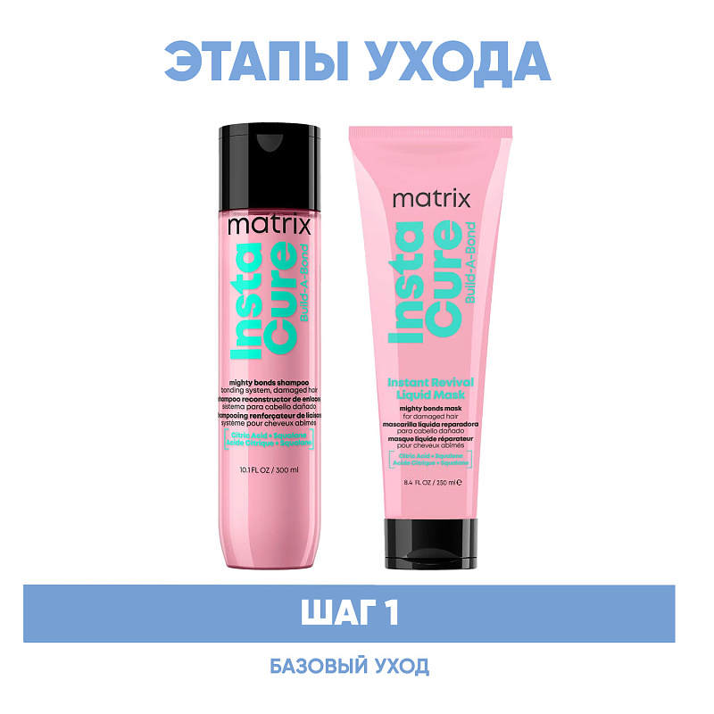 ПРОГРАММА КОМПЛЕКСНОГО УХОДА Matrix Instacure Build-A-Bond для поврежденных волос. Комплексный уход представляет собой дополняющие друг друга средства, совместное использование которых будет максимально эффективным. Первым шагом программы является базовый уход (очищение + питание), вторым – дополнительный уход (средства, усиливающие эффект базовой программы и применяемые постоянно или периодически).