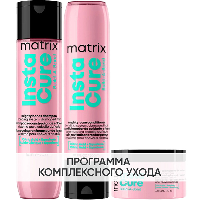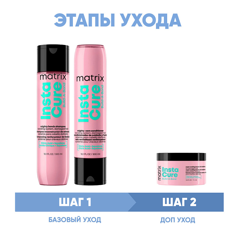 ПРОГРАММА КОМПЛЕКСНОГО УХОДА Matrix Instacure Build-A-Bond для поврежденных волос. Комплексный уход представляет собой дополняющие друг друга средства, совместное использование которых будет максимально эффективным. Первым шагом программы является базовый уход (очищение + питание), вторым – дополнительный уход (средства, усиливающие эффект базовой программы и применяемые постоянно или периодически).