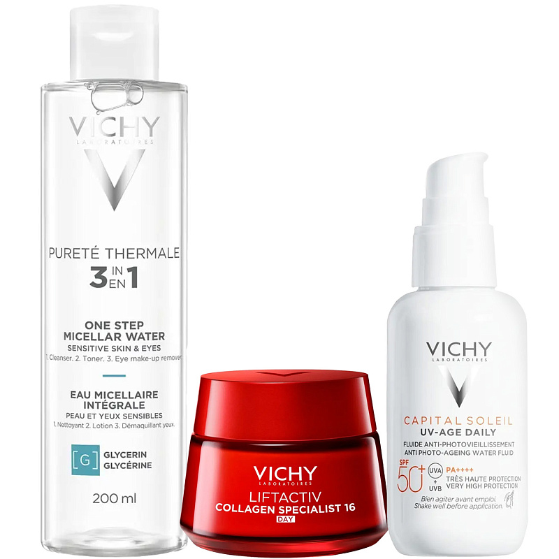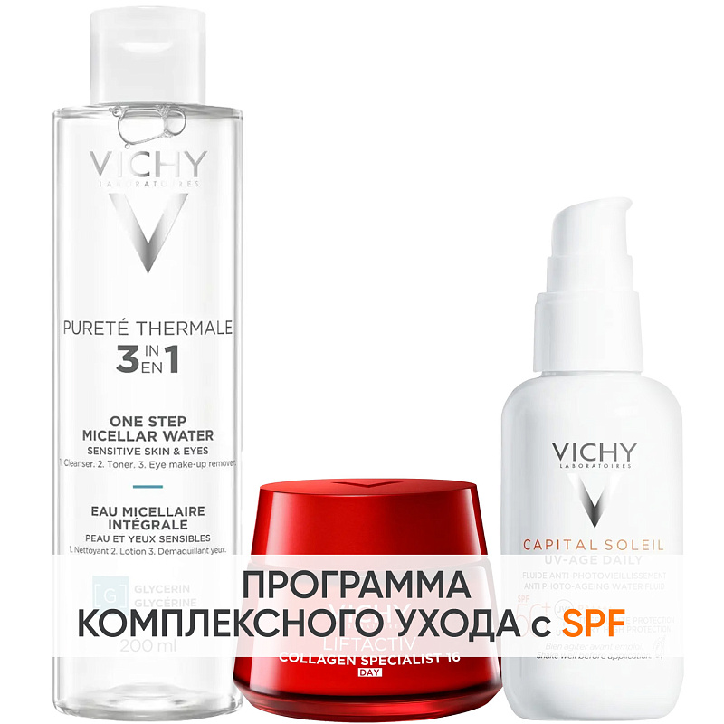 ПРОГРАММА КОМПЛЕКСНОГО УХОДА Vichy Liftactiv Collagen Specialist для борьбы с признаками старения лица. Комплексный уход представляет собой дополняющие друг друга средства, совместное использование которых будет максимально эффективным. Первым шагом программы является очищение, вторым - основной уход. В третий шаг вошли дополнительные средства, усиливающие эффект основной программы и применяемые постоянно или периодически на различных этапах ухода.