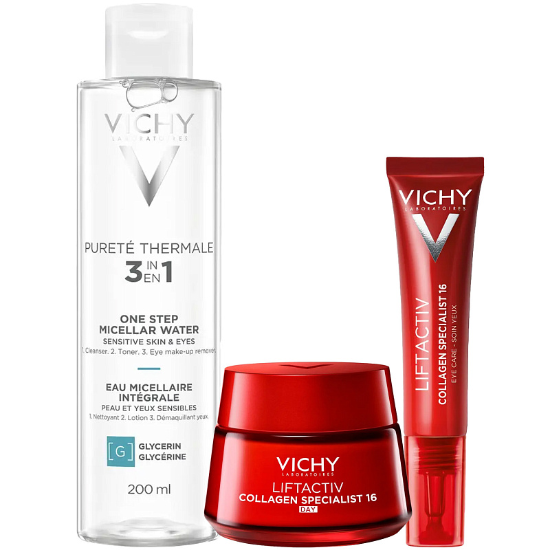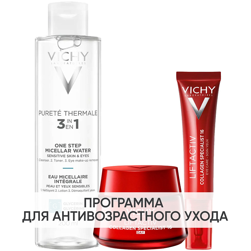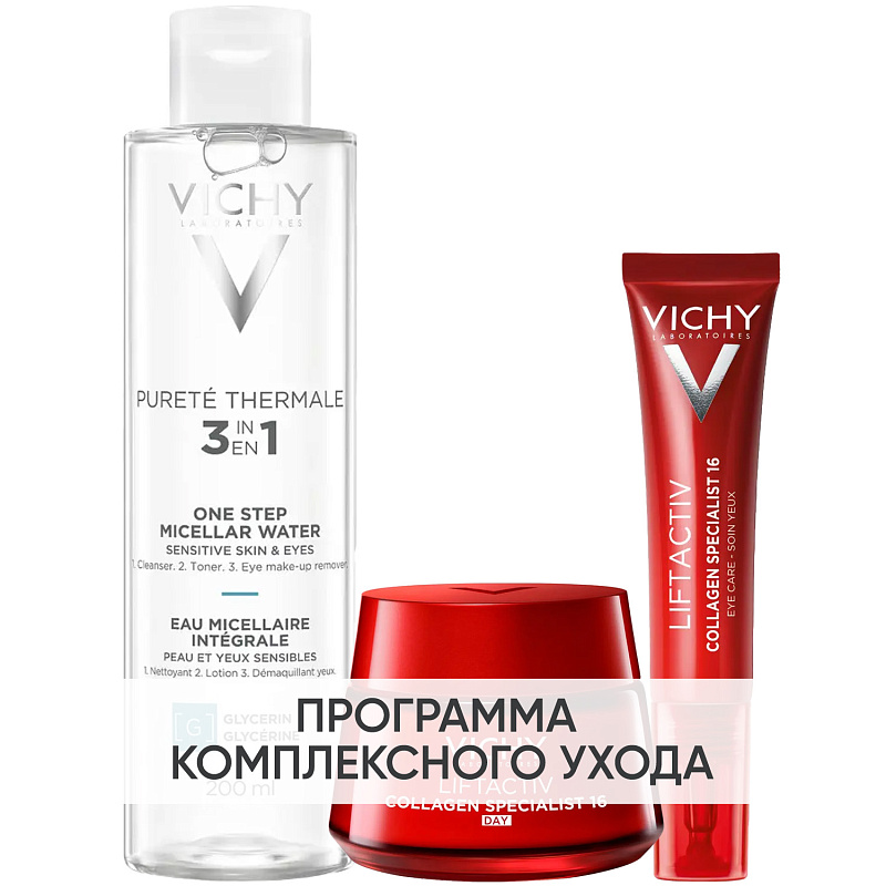 ПРОГРАММА КОМПЛЕКСНОГО УХОДА Vichy Liftactiv Collagen Specialist для борьбы с признаками старения лица. Комплексный уход представляет собой дополняющие друг друга средства, совместное использование которых будет максимально эффективным. Первым шагом программы является очищение, вторым - основной уход. В третий шаг вошли дополнительные средства, усиливающие эффект основной программы и применяемые постоянно или периодически на различных этапах ухода.