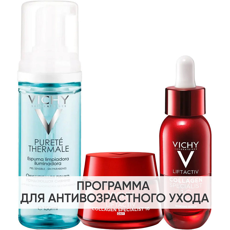 ПРОГРАММА КОМПЛЕКСНОГО УХОДА Vichy Liftactiv Collagen Specialist для борьбы с признаками старения лица. Комплексный уход представляет собой дополняющие друг друга средства, совместное использование которых будет максимально эффективным. Первым шагом программы является очищение, вторым - основной уход. В третий шаг вошли дополнительные средства, усиливающие эффект основной программы и применяемые постоянно или периодически на различных этапах ухода.