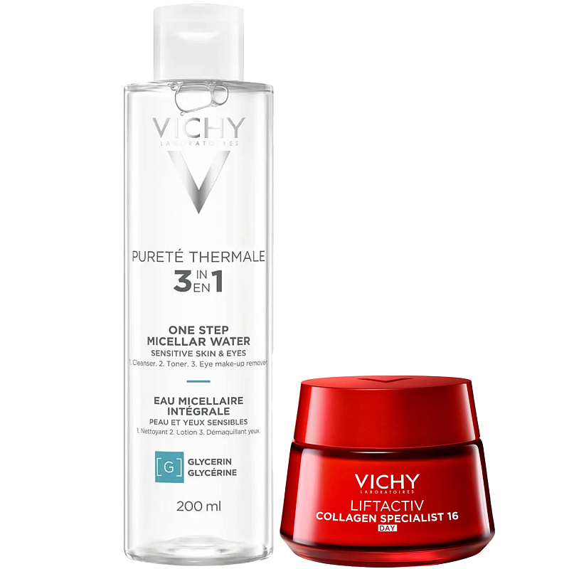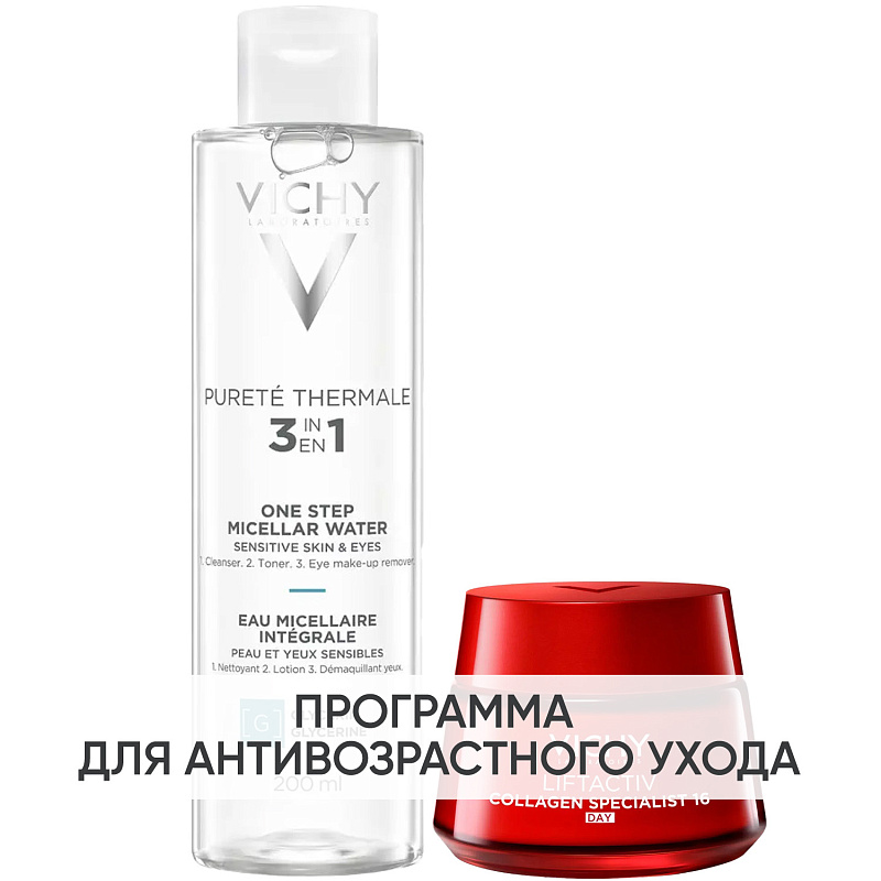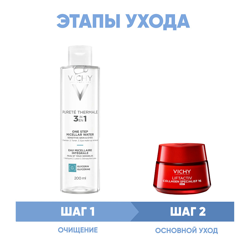 ПРОГРАММА КОМПЛЕКСНОГО УХОДА Vichy Liftactiv Collagen Specialist для борьбы с признаками старения лица. Комплексный уход представляет собой дополняющие друг друга средства, совместное использование которых будет максимально эффективным. Первым шагом программы является очищение, вторым - основной уход.