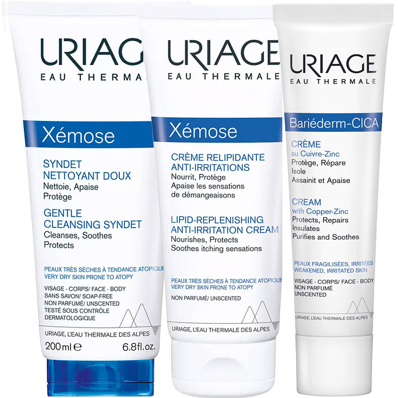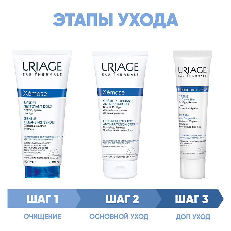 ПРОГРАММА КОМПЛЕКСНОГО УХОДА Uriage Xemose для сухой и очень сухой кожи, склонной к атопии. Комплексный уход представляет собой дополняющие друг друга средства, совместное использование которых будет максимально эффективным. Первым шагом программы является очищение, вторым - основной уход. В третий шаг вошли дополнительные средства, усиливающие эффект основной программы и применяемые постоянно или периодически на различных этапах ухода.