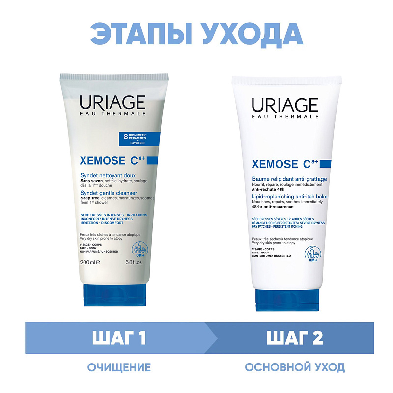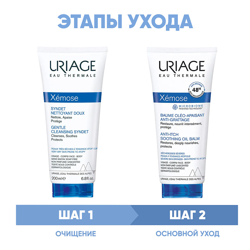 ПРОГРАММА КОМПЛЕКСНОГО УХОДА Uriage Xemose для сухой и очень сухой кожи, склонной к атопии. Комплексный уход представляет собой дополняющие друг друга средства, совместное использование которых будет максимально эффективным. Первым шагом программы является очищение, вторым - основной уход. В третий шаг вошли дополнительные средства, усиливающие эффект основной программы и применяемые постоянно или периодически на различных этапах ухода.