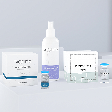Набор включает в себя 3 продукта: биоревитализант TOPAZ, MCA RENEW PEEL, REGENERATING SPRAY.