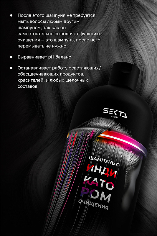 Шампунь с индикатором очищения меняет цвет при контакте с осветляющими, обесцвечивающими средствами, красителями и другими щелочными составами. Шампунь имеет оранжевый оттенок и не содержит тонирующих пигментов. Если на волосах есть остатки кислых или щелочных средств, шампунь меняет цвет на красный, розовый или фиолетовый. Красный оттенок появляется при низком pH, розовый или фиолетовый — при высоком.