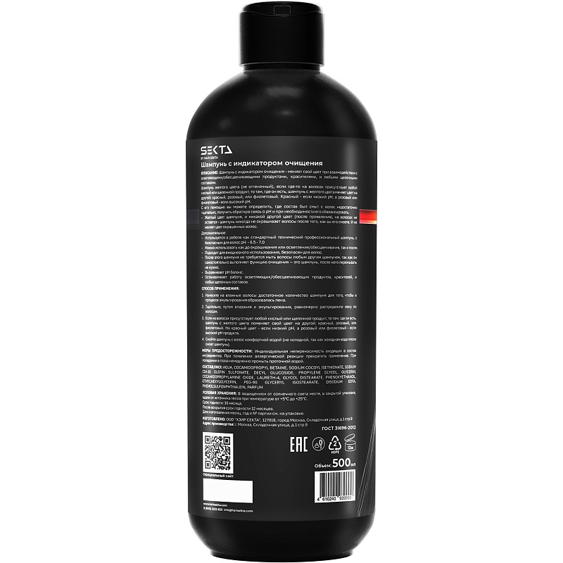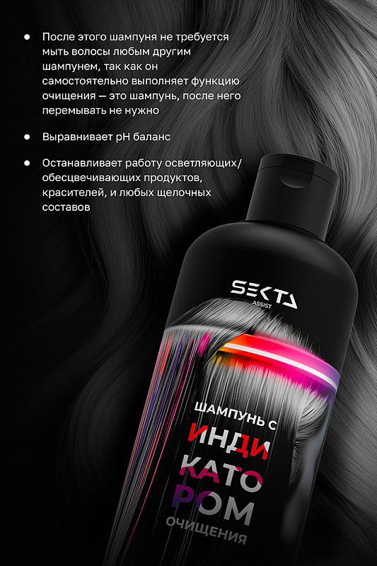 Шампунь с индикатором очищения меняет цвет при контакте с осветляющими, обесцвечивающими средствами, красителями и другими щелочными составами. Шампунь имеет оранжевый оттенок и не содержит тонирующих пигментов. Если на волосах есть остатки кислых или щелочных средств, шампунь меняет цвет на красный, розовый или фиолетовый. Красный оттенок появляется при низком pH, розовый или фиолетовый — при высоком.