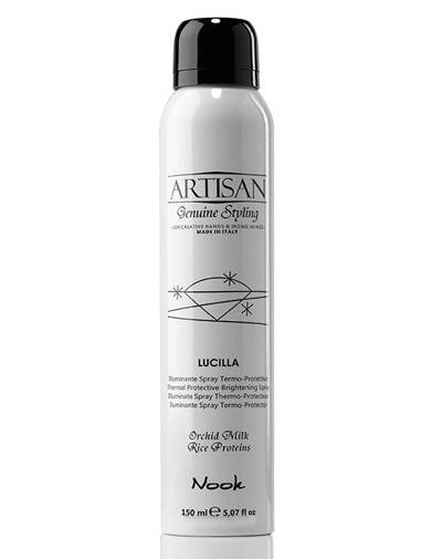 Спрей для защиты волос от высокой температуры Artisan Lucilla Thermal Protective Spray от Nook создает надежную защиту волосам от корней до самых кончиков от механических и термических повреждений. Его формула включает в себя рисовые протеины, молочко орхидеи и фотофильтры. Применение спрея обеспечивает волосам увлажнение, делает волосы послушными и шелковистыми без утяжеления и жирной пленки. Средство незаменимо для защиты волос от воздействия высокой температуры при стайлинге.