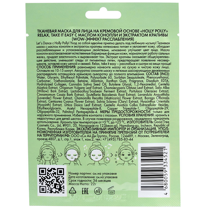 Тканевая маска с маслом конопли и экстрактом крапивы Relax, Take It Easy на кремовой основе, 22 гр