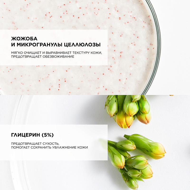 Мягко очищает, отшелушивает и улучшает текстуру кожи