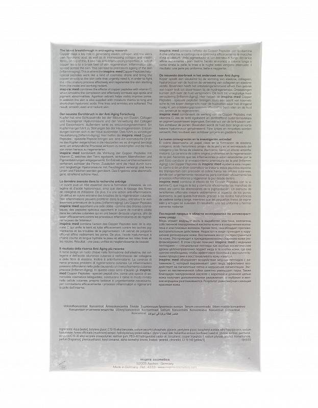 Комбинация Copper Peptides (пептидов меди) и витамина C – оказывает выраженное омолаживающее действие: разглаживает рельеф, выравнивает тон и цвет, повышает упругость и эластичность кожи.