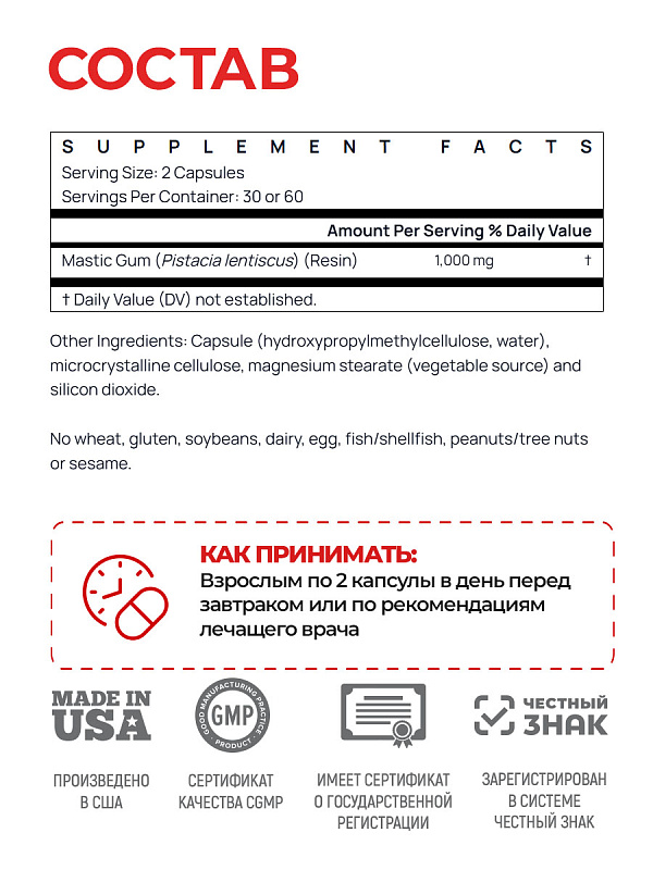 Мастичная смола Mastic Gum 1000 мг, 60 капсул