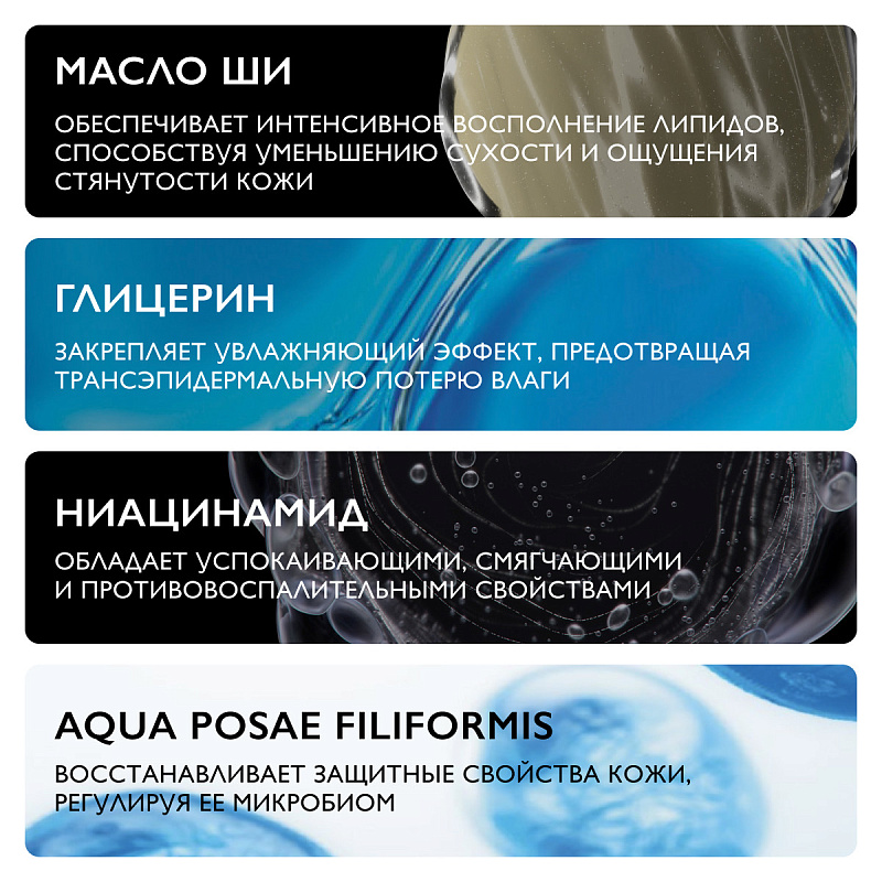 Бережно очищает, сокращает чувство стянутости