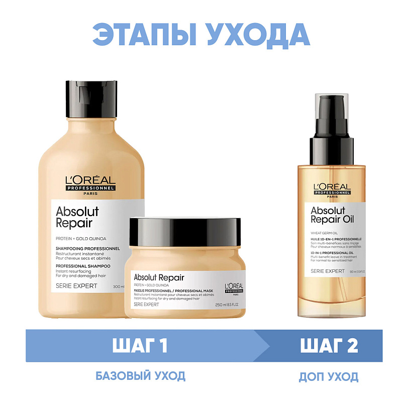 ПРОГРАММА КОМПЛЕКСНОГО УХОДА L'Oreal Professionnel Absolut Repair для поврежденных волос. Комплексный уход представляет собой дополняющие друг друга средства, совместное использование которых будет максимально эффективным. Первым шагом программы является базовый уход (очищение + питание), вторым – дополнительный уход (средства, усиливающие эффект базовой программы и применяемые постоянно или периодически).