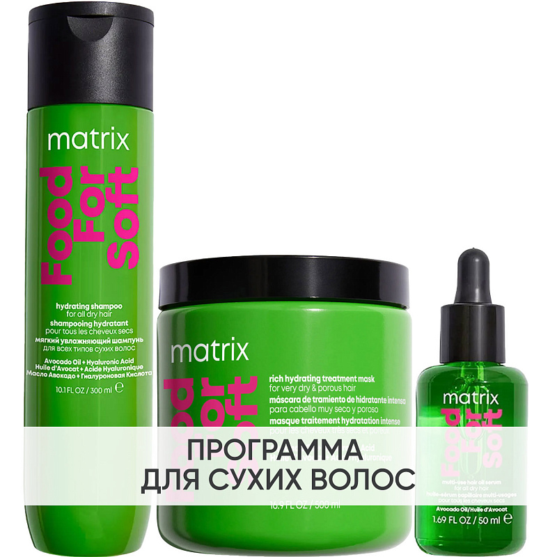 ПРОГРАММА КОМПЛЕКСНОГО УХОДА Matrix Food For Soft для сухих волос всех типов: пористых, волнистых, обесцвеченных, окрашенных, сильно поврежденных. Комплексный уход представляет собой дополняющие друг друга средства, совместное использование которых будет максимально эффективным. Первым шагом программы является базовый уход (очищение + питание), вторым – дополнительный уход (средства, усиливающие эффект базовой программы и применяемые постоянно или периодически).
