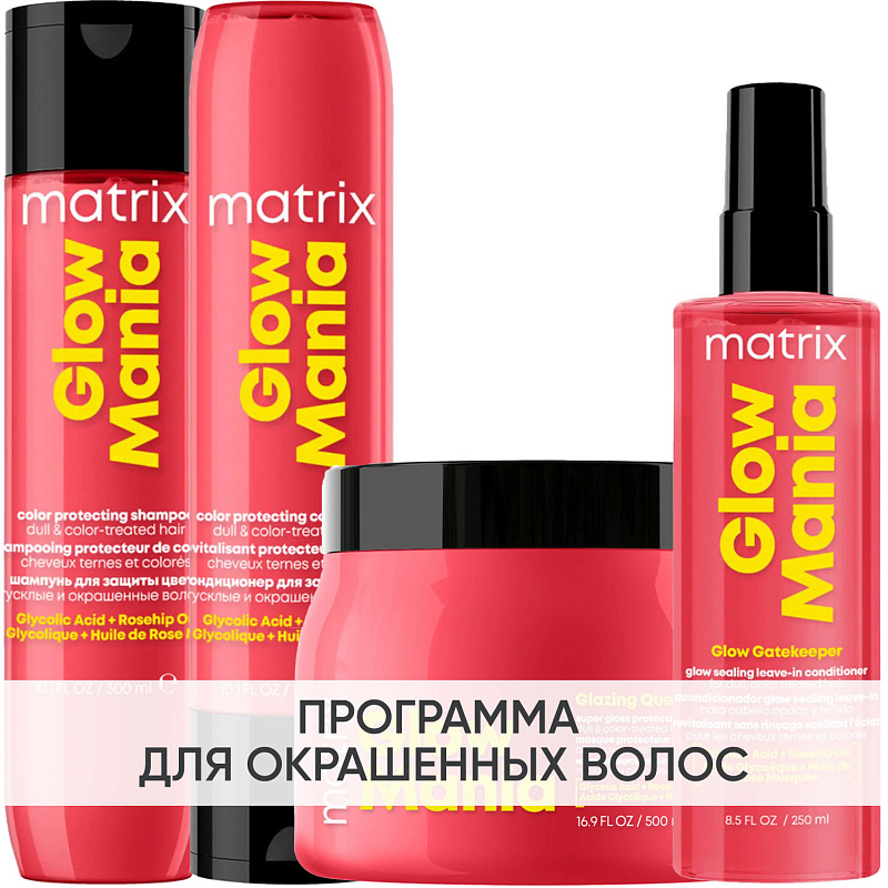 ПРОГРАММА КОМПЛЕКСНОГО УХОДА Matrix Glow Mania для окрашенных и тусклых волос. Комплексный уход представляет собой дополняющие друг друга средства, совместное использование которых будет максимально эффективным. Первым шагом программы является базовый уход (очищение + питание), вторым – дополнительный уход (средства, усиливающие эффект базовой программы и применяемые постоянно или периодически).