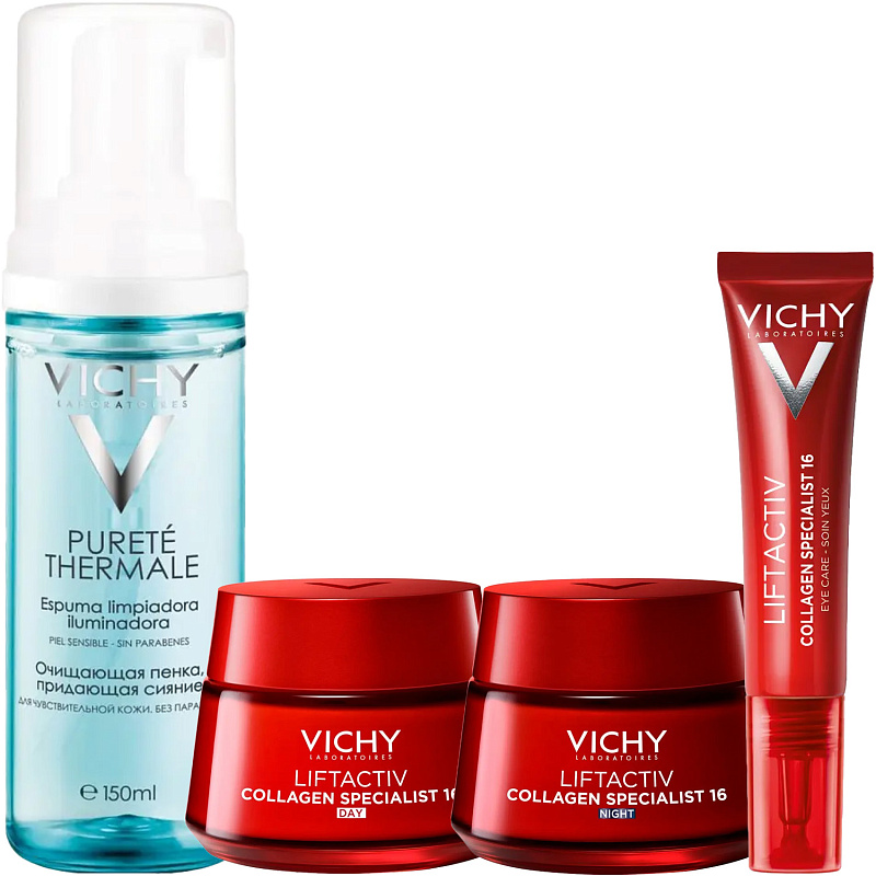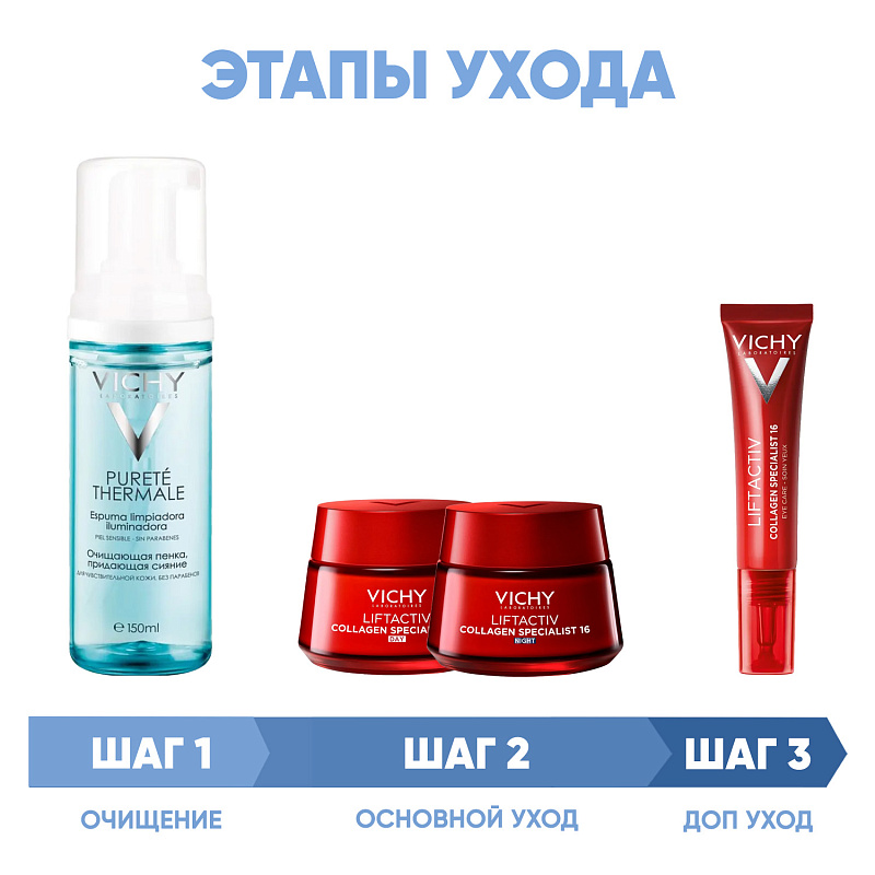 ПРОГРАММА КОМПЛЕКСНОГО УХОДА Vichy Liftactiv Collagen Specialist для борьбы с признаками старения лица. Комплексный уход представляет собой дополняющие друг друга средства, совместное использование которых будет максимально эффективным. Первым шагом программы является очищение, вторым - основной уход. В третий шаг вошли дополнительные средства, усиливающие эффект основной программы и применяемые постоянно или периодически на различных этапах ухода.