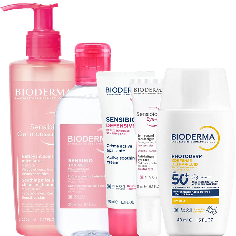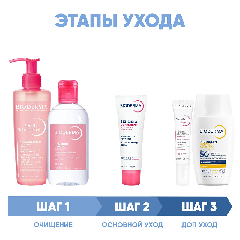ПРОГРАММА КОМПЛЕКСНОГО УХОДА Bioderma Sensibio для чувствительной кожи, склонной к покраснениям, раздражениям, к появлению аллергии, купероза, розацеа и дерматита. Комплексный уход представляет собой дополняющие друг друга средства, совместное использование которых будет максимально эффективным. Первым шагом программы является очищение, вторым - основной уход. В третий шаг входят дополнительные средства, усиливающие эффект основной программы и применяемые постоянно или периодически на различных этапах ухода.