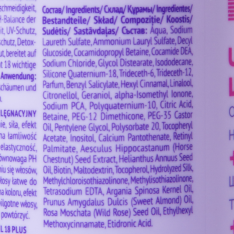 Состав: aqua, sodium laureth sulfate, ammonium lauryl sulfate, decyl glucoside, cocamidopropyl betaine, cocamide dea, sodium chloride, glycol distearate, isododecane, silicone quaternium-18, trideceth-6, trideceth-12, parfum, sodium pca, polyquaternium-10, citric acid, betaine, peg-12 dimethicone, peg-35 castor oil, pentylene glycol, polysorbate 20, tocopheryl acetate, inositol, calcium pantothenate, retinyl palmitate, aesculus hippocastanum (horse chestnut) seed extract, helianthus annuus seed oil, biotin, maltodextrin, tocopherol, hydrolyzed silk, methylchloroisothiazolinone, methylisothiazolinone, tetrasodium edta, argania spinosa kernel oil, prunus amygdalus dulcis (sweet almond) oil, rosa moschata (wild rose) seed oil, ethylhexyl methoxycinnamate, etidronic acid
