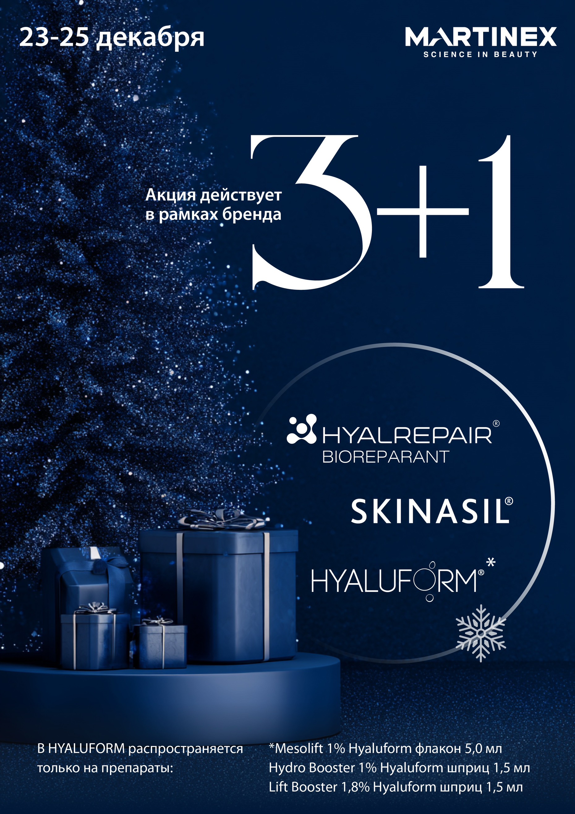 Только 3 дня - 23,24 и 25 декабря, для вас действует уникальное предложение. При покупке 3-х препаратов брендов HYALREPAIR Биорепарант, Skinasil и HYALUFORM* - четвертый препарат по наименьшей или равной стоимости в подарок!