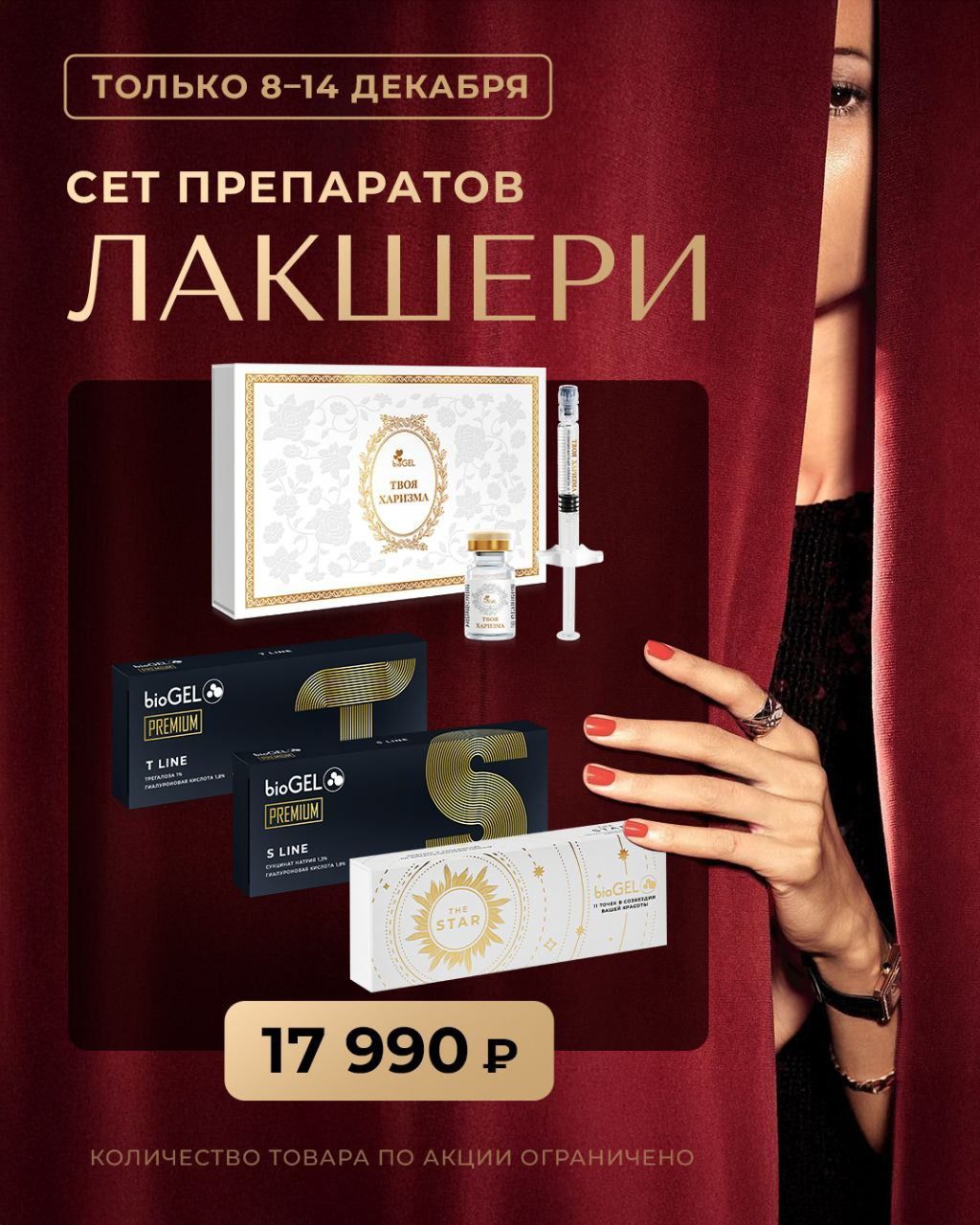 С 8 по 14 декабря при покупке сета препаратов BioGel ЛАКШЕРИ (Твоя харизма, T-Line, S-line, The star) действует специальная цена 17 990 рублей.