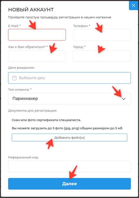 Заполните обязательные поля в форме регистрации. Добавьте скан или фото сертификата специалиста.