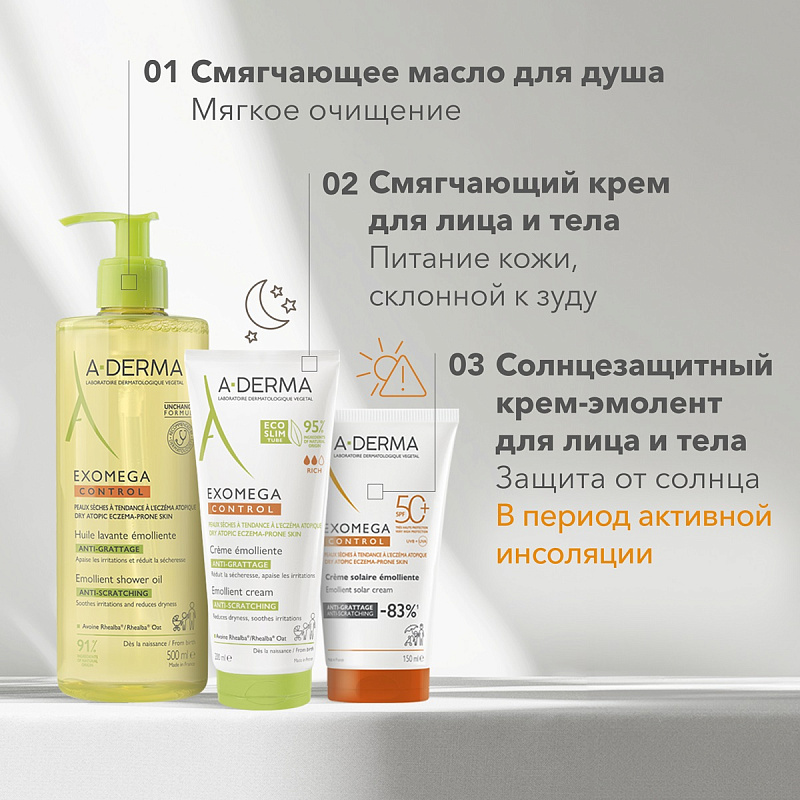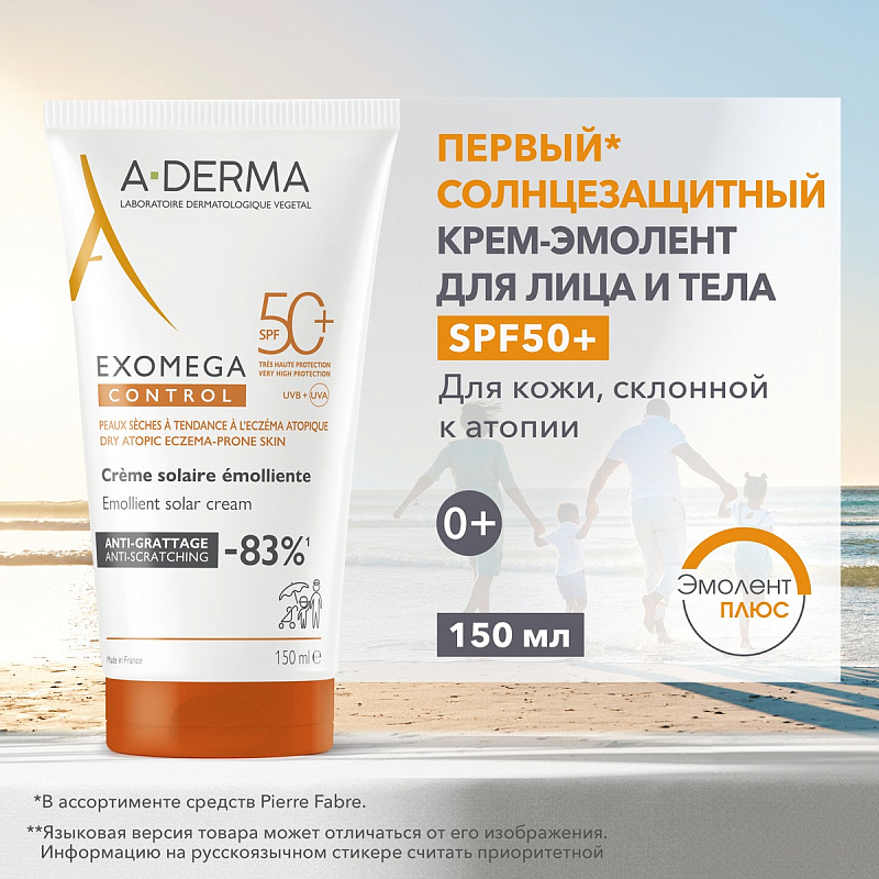 Смягчающий солнцезащитный крем-эмолент для лица и тела Exomega Control SPF50+ 6 мес+, 150 мл