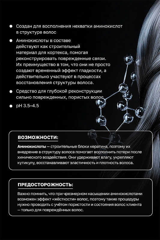 - аминокислоты действуют как строительный материал, восстанавливая повреждённые связи внутри волоса. Они не просто придают гладкость, а активно участвуют в регенерации структуры волоса.