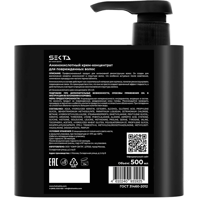 Состав: aqua, hydrolyzed keratin, cetearyl alcohol, glutamic acid, propylene glycol, behentrimonium methosulfate, paraffinum liquidum, cetrimonium chloride, betaine, hydroxyethylcellulose, stearamidopropyl dimethylamine, pentylene glycol, keratin, arginine, threonine, lysine, phenylalanine, alanine, aspartic acid, cysteine, glycine, histidine, isoleucine, leucine, methionine, proline, serine, tyrosine, valine, tocopheryl acetate, hydrolyzed wheat gluten, polyquaternium-37, propylene glycol dicaprylate/dicaprate, ppg-1 trideceth-6, methylchloroisothiazolinone, methylisothiazolinone, disodium edta, parfum.