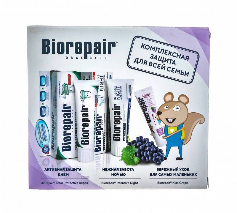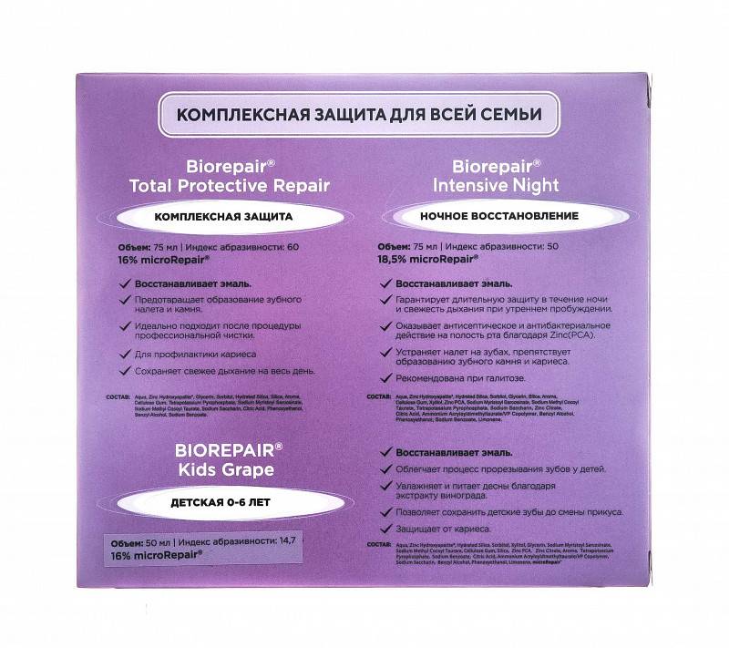 • Biorepair Kids детская зубная паста с экстрактом винограда, 50 мл— это детская зубная паста, которая за счет частицы microRepair укрепляет и восстанавливает эмаль молочных зубов. Состав частиц идентичен природному гидроксиапатиту, из которого состоят эмаль и дентин. Благодаря игольчатой структуре частицы microRepair встраиваются в зубную эмаль, заполняя микротрещины, восстанавливают ее и делают гладкой. Эффективность пасты клинически-протестирована.