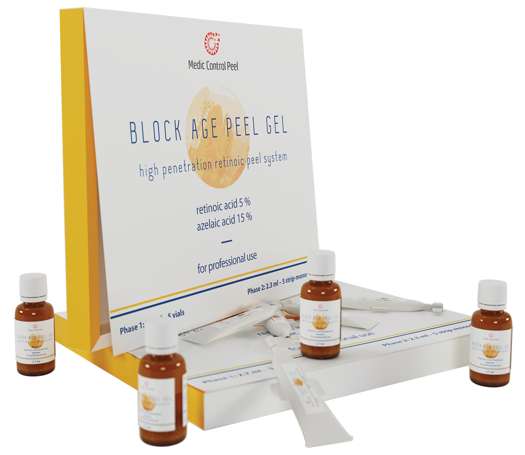 Фаза №2 – гель с характерным резким запахом, содержит в составе диметилсульфоксид, обладающий выраженной проникающей способностью через кожу и слизистые оболочки, значительно повышает проницаемость всех биологических мембран для основного действующего компонента - ретиноевой кислоты. Поэтому, перед нанесением Block Age Peel Gel не требуется применения каких-либо кератолитических препаратов или иных пилинговых составов. При попадании воды в готовый состав Block Age Peel Gel происходит усиление специфического запаха, поэтому для проведения процедуры необходимо применять только сухие кисти и емкости.