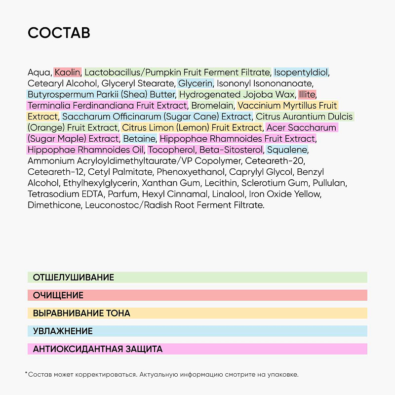 Состав: aqua, kaolin, lactobacillus/pumpkin fruit ferment filtrate, isopentyldiol, cetearyl alcohol, glyceryl stearate, glycerin, isononyl isononanoate,, butyrospermum parkii (shea) butter, hydrogenated jojoba wax, illite, terminalia ferdinandiana fruit extract, bromelain, vaccinium myrtillus fruit extract, saccharum ocinarum (sugar cane) extract, citrus aurantium dulcis (orange) fruit extract, citrus limon (lemon) fruit extract, acer saccharinum (sugar maple) extract, betaine, hippophae rhamnoides extract, daucus carota sativa (carrot) root extract, glycine soja (soybean) oil, beta-carotene, tocopherol (mixed), beta sitosterol, squalene, ammonium acryloyldimethyltaurate/vp copolymer, ceteareth-20, ceteareth-12, cetyl palmitate, phenoxyethanol, caprylyl glycol, benzyl alcohol, xanthan gum, lecithin, sclerotium gum, pullulan, disodium edta, parfum, hexyl cinnamal, linalool, iron oxide yellow, dimethicone