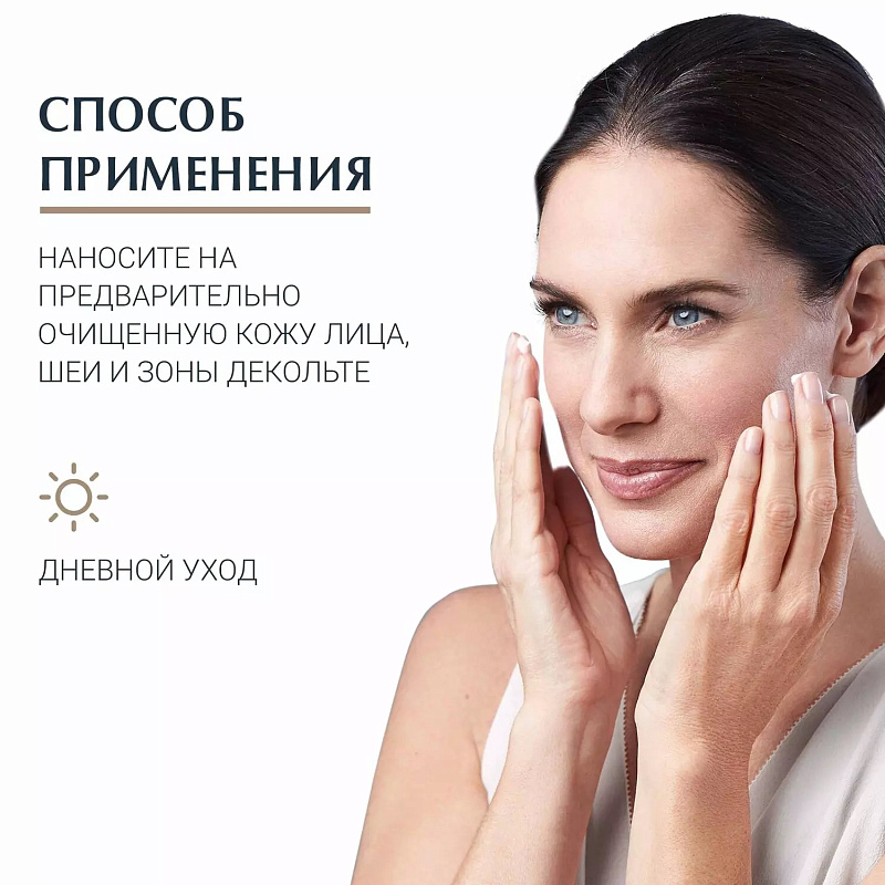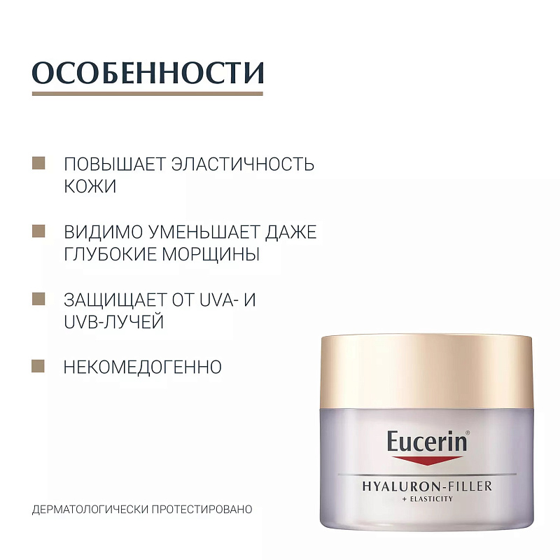 Уникальная формула обеспечивает различное благоприятное действие, замедляющее старение. Инновационная композиция Eucerin, содержащая как высокомолекулярную, так и низкомолекулярную гиалуроновую кислоту, заметно разглаживает глубокие морщины. Арктиин (активный агент, ускоряющий обновление коллагена в клетках кожи) усиливает действие силимарина (мощный антиоксидант, защищающий коллаген и эластин от разрушения и улучшающий кровообращение на клеточном уровне). Кожа становится упругой и гладкой и выглядит свежей и сияющей.