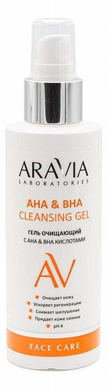 Для очищающего ухода за лицом косметологи Aravia Laboratories предлагают гель Cleansing Gel с АНА и ВНА кислотами. Средство на базе гликолевой, салициловой, уксусной, молочной кислоты активно удаляет косметику и бытовые загрязнения, размягчает и отслаивает ороговевший клеточный слой.