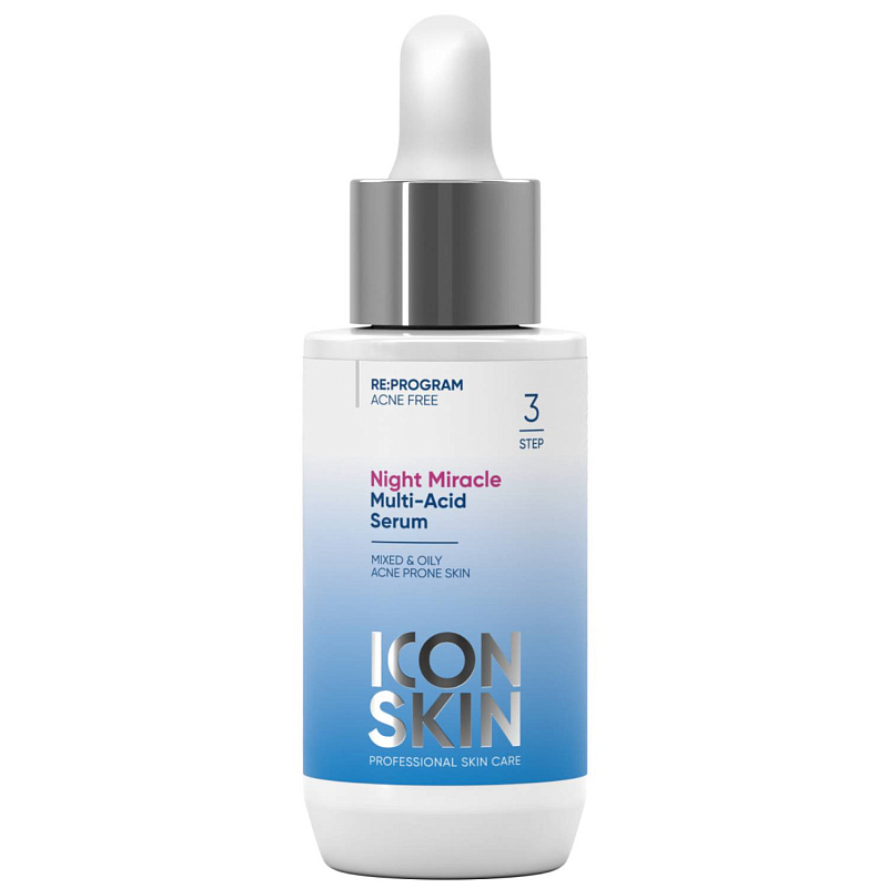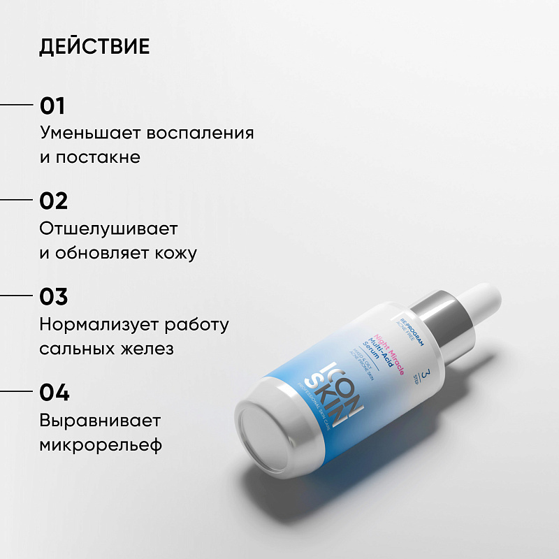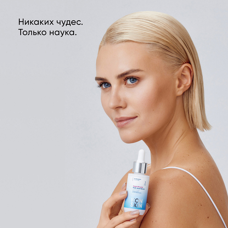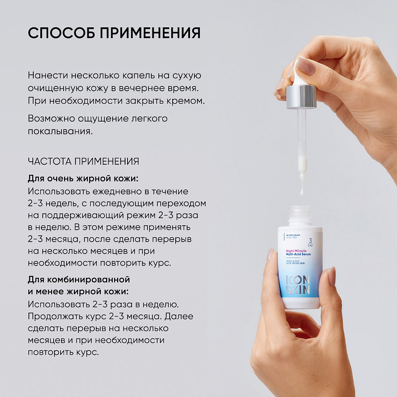 Ночная сыворотка - это средство для ухода за комбинированной и жирной проблемной кожей на основе кислот различных групп (AHA+PHA+ BHA). Сыворотка эффективно борется с акне, обновляет и отшелушивает верхний ороговевший слой кожи и очищает поры. Концентрация кислот в составе – 10%, pH=4.